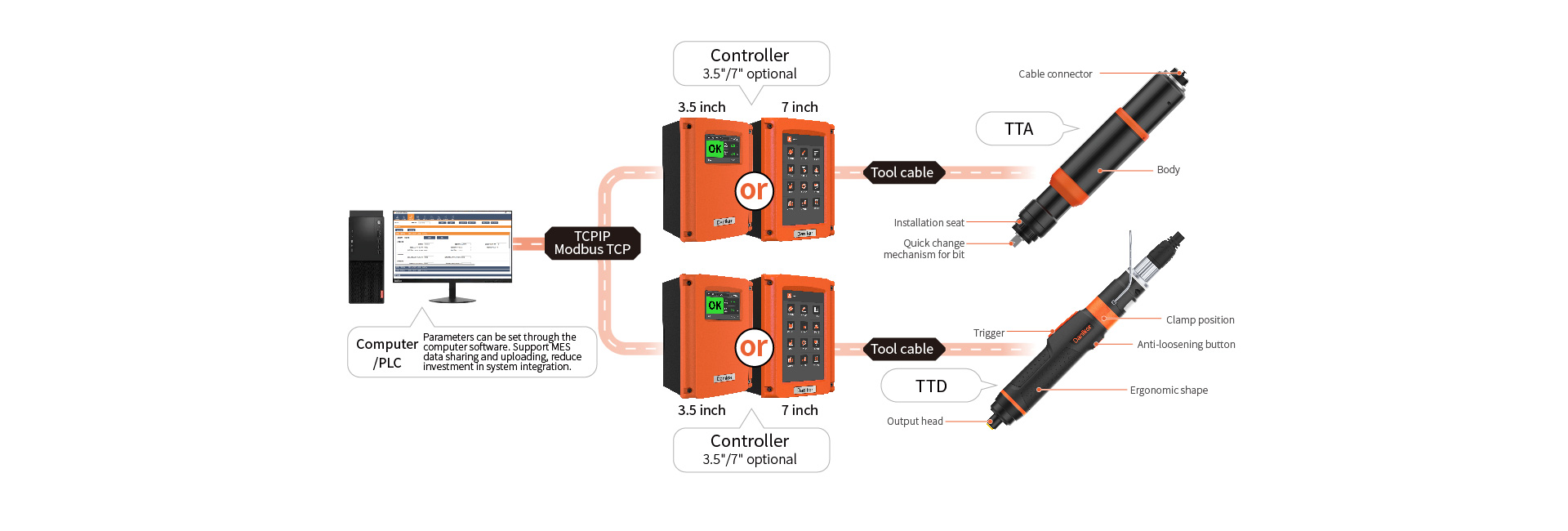 Stable and durable performance, extended torque range, maximum torque of 200Nm, high-accuracy tightening, clamping torque control to ensure that each screw achieves the best tightening state. 7-inch large screen, programmable; real-time curve can be seen; historical data can be consulted. For the 3.5-inch screen, you can check the tightening results and switch the Pset.